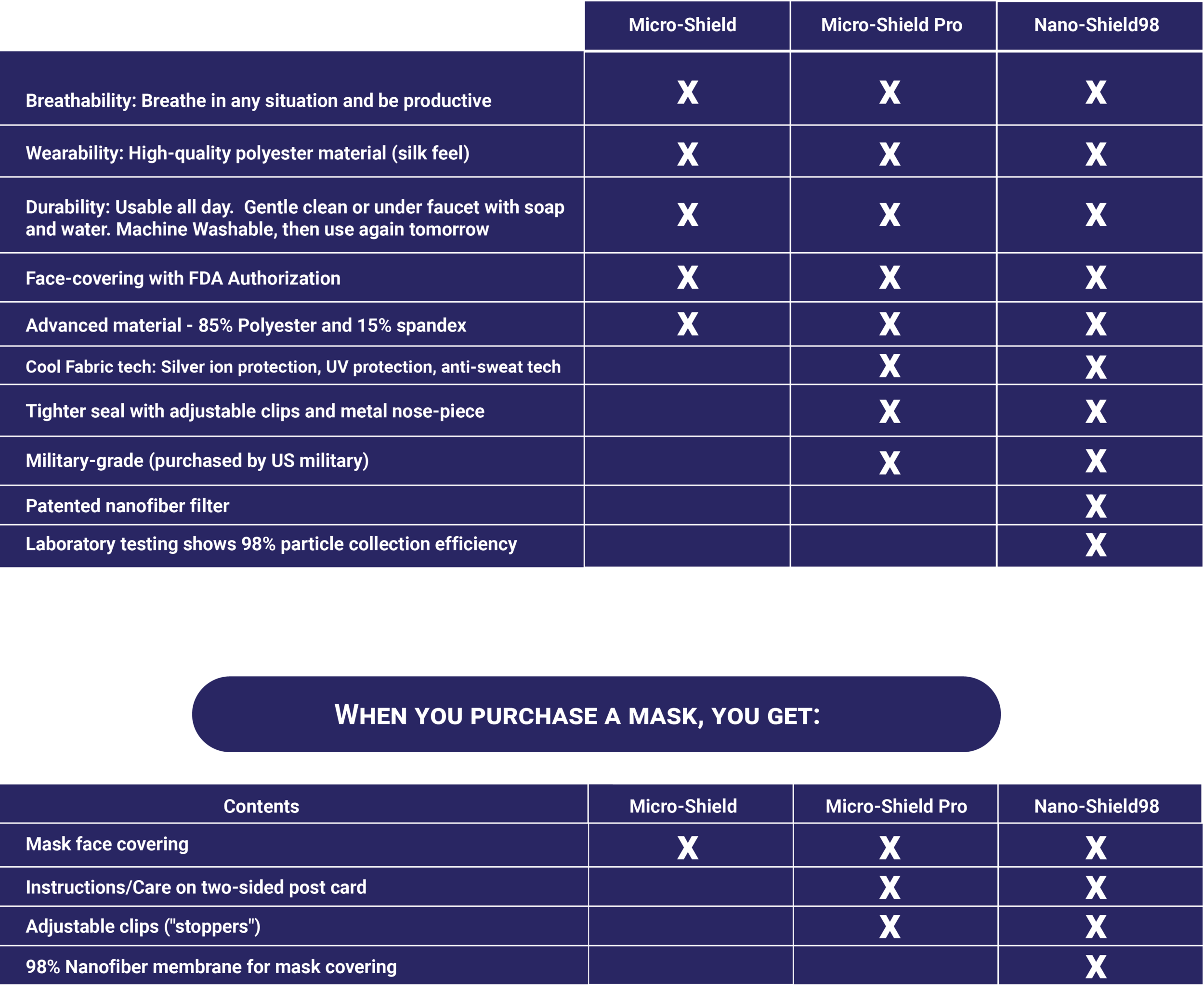 CHOOSE AMONG MICRO-SHIELDTM AND MICRO-SHIELDTM PRO and NANO-SHIELD98TM MASKS: The New Standard for PPE